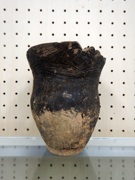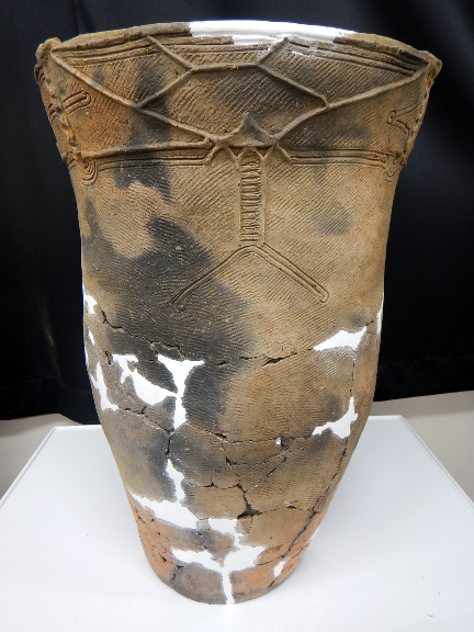 深鉢型土器は主に煮炊きに使われた大きな土器で、表面に黒いすすがついている。生物と思われるモチーフが見られる。 |